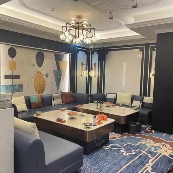 设计团队主动舍弃复杂的主题叙事,转而以高级灰、爱马仕橙与香槟金为空间主色,大面积留白配合局部跳色点缀,既有商务场域的沉稳克制,又不失派对氛围的灵动活力。大堂中央的天马艺术装置以抽象线条勾勒,不锈钢镜面材质随光影流转,低调呼应品牌意象。包厢区没有冗余的装饰堆砌,墙面是质感细腻的硬包布艺,地面铺陈易清洁的仿大理石瓷砖,沙发进深与靠背角度经过反复测试,确保长时间欢谈亦不腰酸背痛。这里的美学逻辑清晰而诚实:为舒适的社交体验服务,而非为拍照打卡存在。